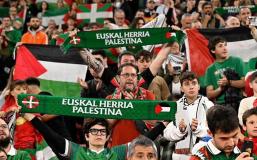 رفع لافتات داعمة لغزة وأعلام فلسطين، خلال افتتاح مباراة المنتخب الفلسطيني مع منتخب الباسك الإسباني